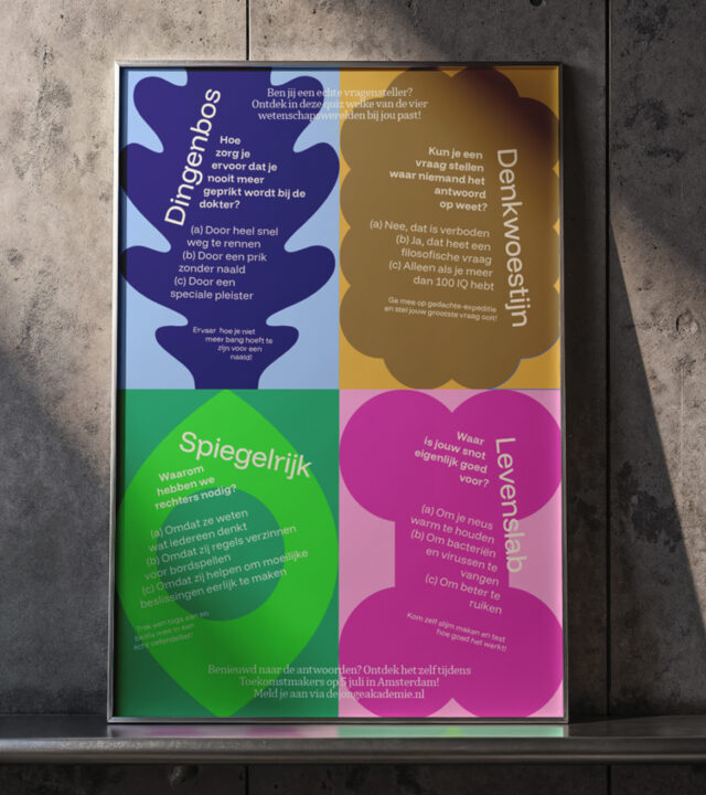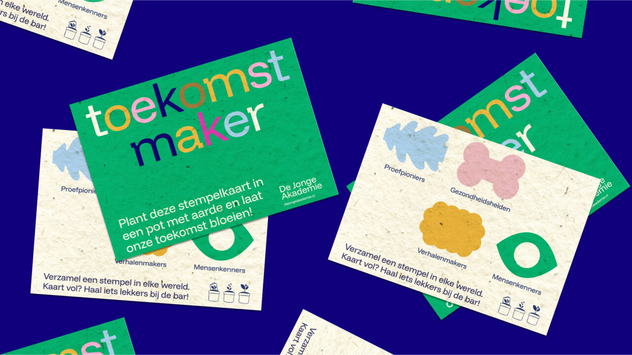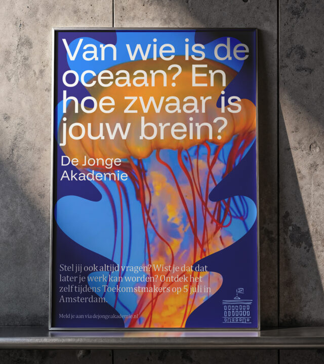 We developed Toekomstmakers (Future Makers): a full campaign identity with a colorful, playful style that appeals to the target audience while staying true to De Jonge Akademie. No dry science communication, but provocative questions like ‘Who owns the ocean?’ and ‘How heavy is your brain?’ paired with striking visuals of jellyfish, brains and microscopic worlds.