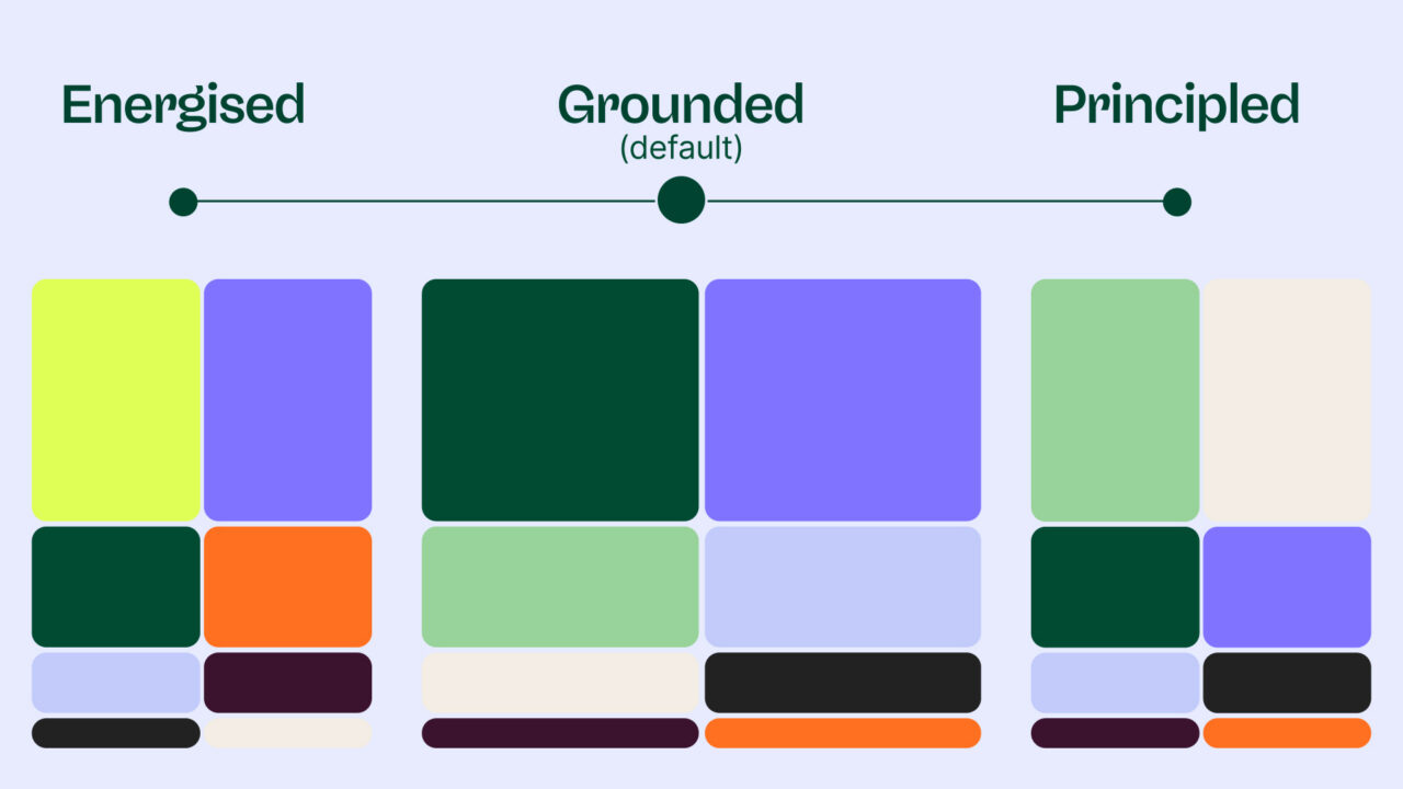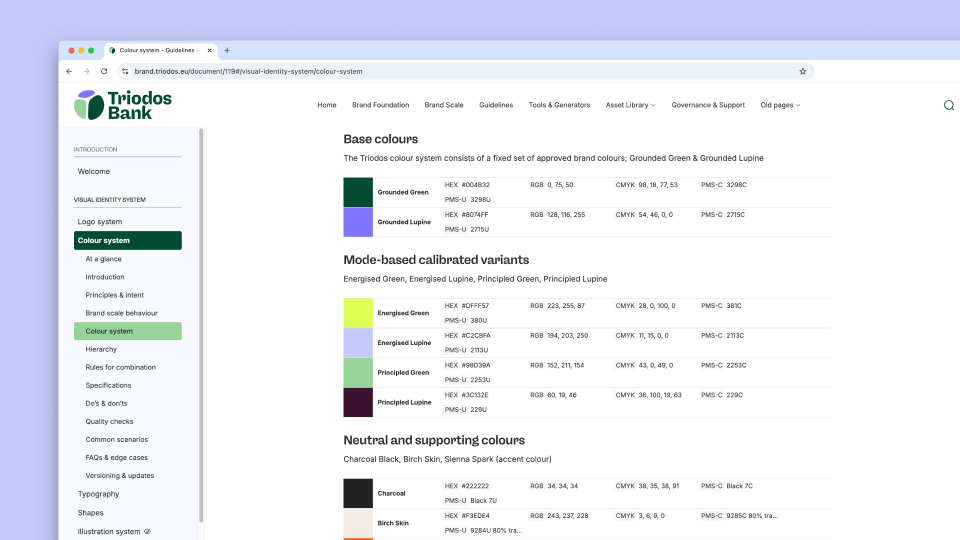 Dat leidde tot een merksysteem met drie brand scales: Energised, Grounded en Principled. Het volledige kleurenpalet verschuift mee. Een jongerencampagne vraagt om andere energie dan een jaarverslag, maar het blijft herkenbaar hetzelfde merk. De visuele elementen verhouden zich zoals deelnemers binnen het Triodos-systeem, organisch, in wisselwerking, steeds nieuwe gehelen vormend.