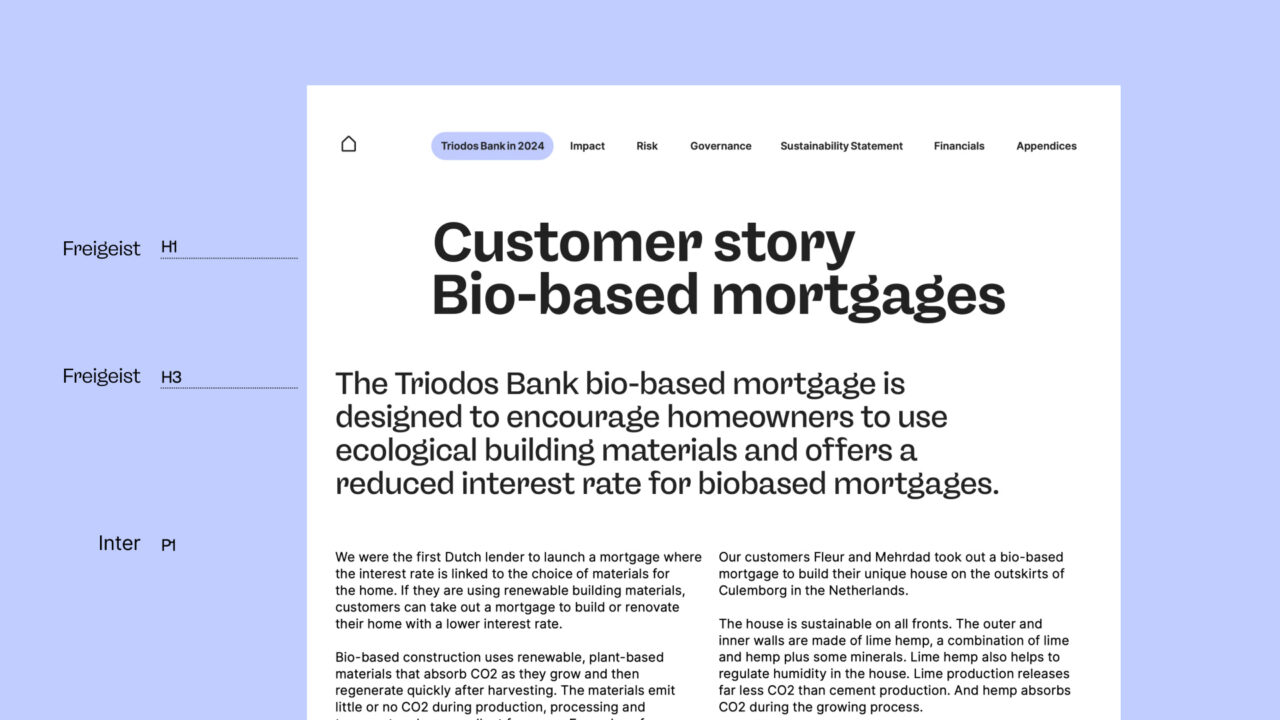 De typografie is Freigeist, een lettertype waarvan de organische vormen de verbondenheid met de natuur uitdrukken. De kleur groen is bewust behouden, omdat het staat voor waar Triodos al veertig jaar op bouwt: stabiliteit, betrouwbaarheid en natuur. Het kleurenpalet daaromheen is per Europese markt cultureel onderzocht, zodat het merk lokaal geworteld voelt in plaats van opgelegd.